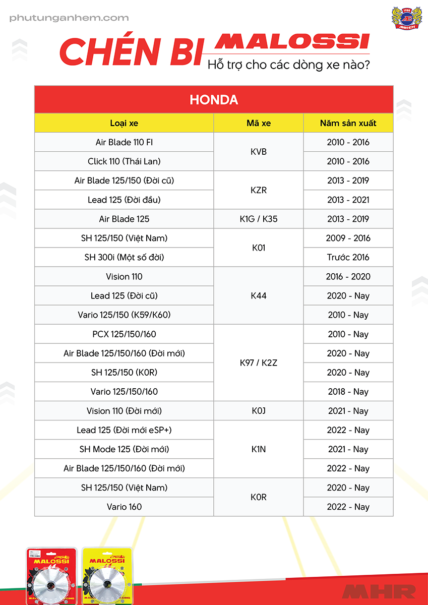 Để đảm bảo bạn chọn đúng chén bi Malossi, hãy đối chiếu mã xe và năm sản xuất của xe bạn với thông tin trong bảng dưới đây. Đây là danh sách đầy đủ các dòng xe Honda tương thích: