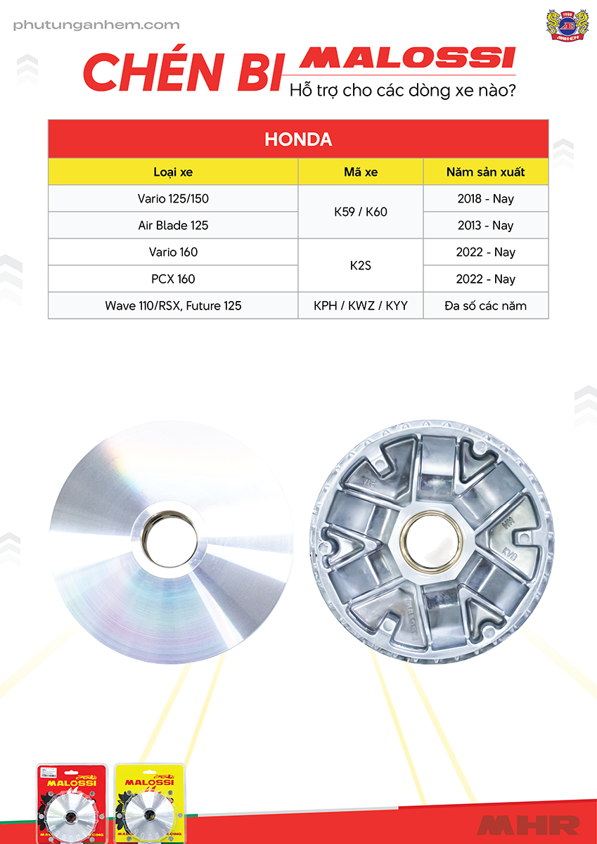 Bảng Tra Cứu Chi Tiết: Chén Bi Malossi Tương Thích Với Xe Honda Theo Mã Xe & Năm Sản Xuất