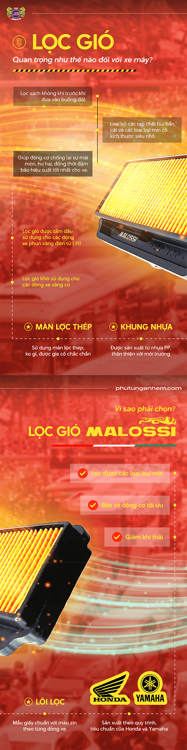 - Tương thích với hầu hết các dòng xe Honda & Yamaha, cả FI và xăng cơ (theo từng mã lọc).