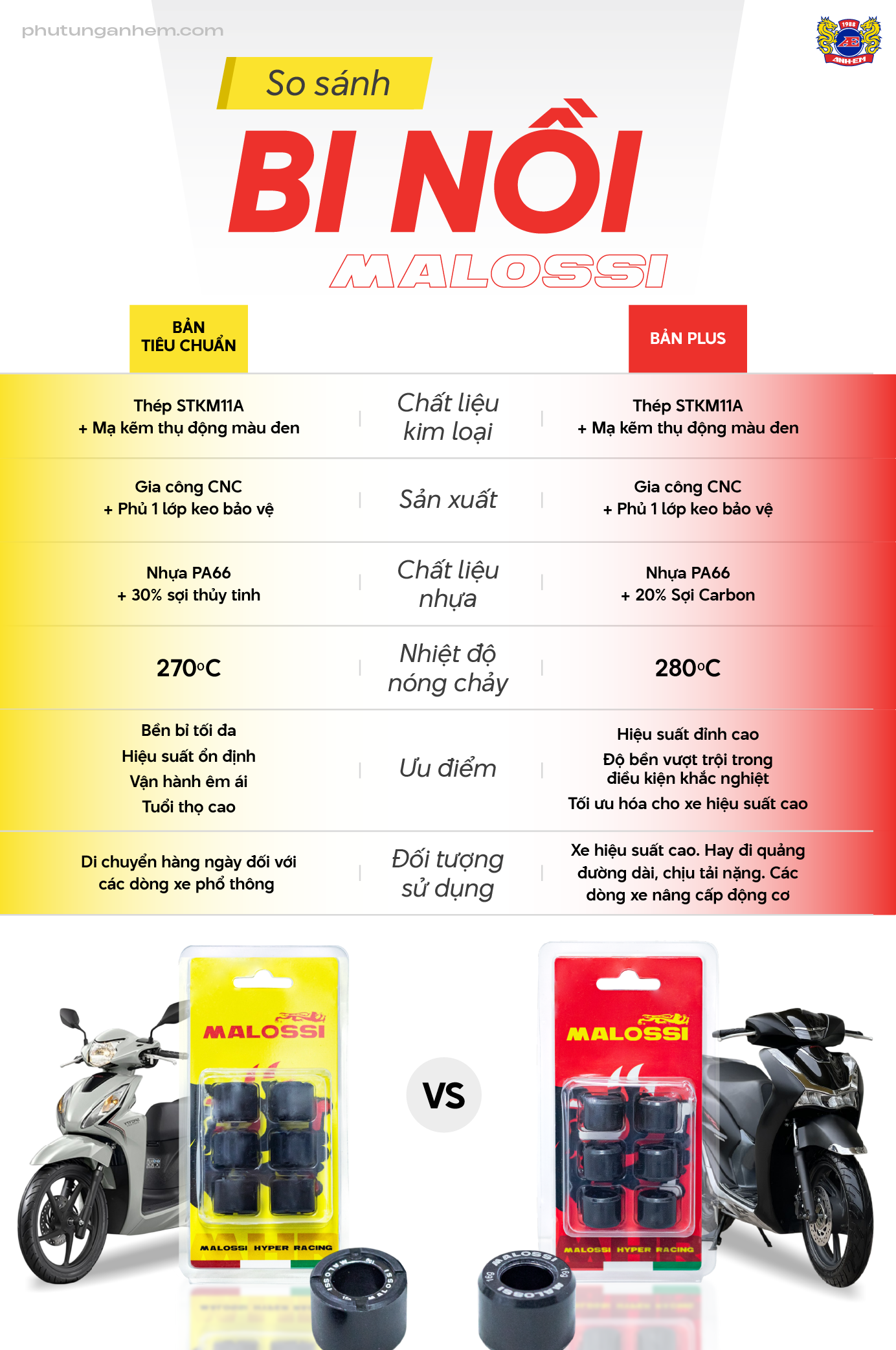 Để "hồi sinh" sức mạnh và sự mượt mà cho xế yêu, việc lựa chọn bi nồi chất lượng là vô cùng quan trọng. Malossi – thương hiệu phụ tùng hiệu suất cao hàng đầu từ Ý – mang đến hai lựa chọn bi nồi vượt trội: Bản Tiêu Chuẩn và Bản PLUS.